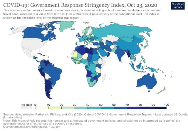 Men det meste peker nå mot at pandemien belaster økonomien mer jo mer viruset får spre seg. Og det er en myte at vi har så strenge tiltak i Norge. Se bilder. Det første viser klar sammenheng mellom god kontroll på smittespredningen og godt økonomisk utkomme. Taiwan og Sør-Korea troner på listen. Norge og Finland ligger også høyt på listen. Sverige gjør det dårligere. Mens land som har vært hardt rammet, som Peru og Spania, har hatt størst økonomisk nedtur. Den andre viser at Norge er blant de land i verden med minst strenge tiltak. Figurene er tilgjengelig her: https://ourworldindata.org/covid-health-economy...